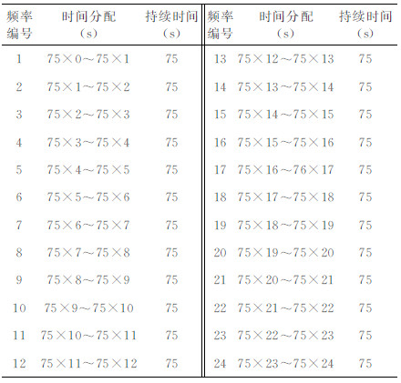 假设需要发射的频率有24个,每个发射75 s,那么一天中第一个循环所需要发射的频率如表一所示,循环一周所需要的时间为30 min,可以整除于8×3600=28800 s.同样,接下来的时间,按照循环规则,又从第一个频点开始,可列出第二个周期第三个周期等等,对表 1等其他循环表用数学归纳法不难得到一天中任意时刻应该发射的频率编号公式为
