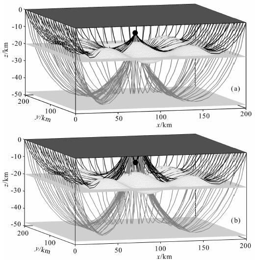 这里所谓分区多步计算中的分区是指在模型参数化时, 可根据速度界面的具体分布情况将模型分成若干个独立的计算区域(相邻的区域由界面连接); 而所谓多步计算则是根据所要计算地震震相的种类从炮点所在的区域逐区(步)进行计算.具体来说, 自炮点所在的单元开始进行扫描, 按照一定的步长进行波前扩展.等当前区域所有网格单元内节点都计算完毕后, 波前停留在该区的速度离散界面上.若追踪下行透射(或透射转换)波, 则从速度界面中走时最小的点开始(惠更斯原理, 视为次级震源), 继续新区内的波前扩展和射线追踪; 若追踪上行反射(或反射转换)波, 则从速度界面中走时最小的点开始, 继续原区内的波前扩展和射线追踪.若存在转换波, 则调用相应的速度模型.按照上述步骤重复则可实现多震相地震射线的追踪计算[29-30].作为一个例子, 图 1给出了多震相地震射线路径(所用速度模型和界面位置分布参见随后反演实例), 其中图 1a显示了来自两个不同界面的反射波的射线路径; 图 1b则为自炮点激发的P波上行至地表, 经反射后分别下行至第一、二个反射界面, 然后反射且上行至检波器的多次反射波的射线路径.