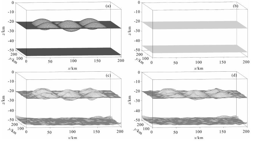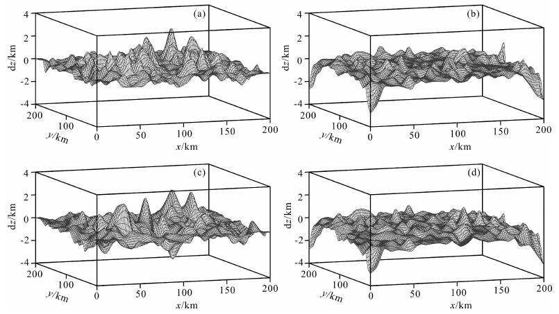 图 9中给出了两种反演算法更新后的反射界面分布(图 9c:V+R反演结果; 图 9d:V+R+S反演结果).从更新的界面来看, 下界面(水平界面)的反演结果两种算法基本相同, 而上界面(起伏波浪式界面), 则双参数(V+R算法)反演结果略好于三参数(V+R+S算法)的反演结果.这一点也是在预料之中, 毕竟三参数同时反演的难度要远大于双参数反演的难度.然而, 无论怎样, 波浪式起伏界面能够更新到这种程度(图 9d所示)也再次证明三参数同时反演的可行性和有效性.为更进一步评价界面更新的结果, 我们给出了两种反演更新的界面与真实界面间的差异图(图 10).从图 10中可以看出两种反演对界面的更新程度还是比较理想的, 只是下界面(图 10b和图 10d)在界面的四个角上更新相对较差, 这主要是因为穿过这里的射线较少.