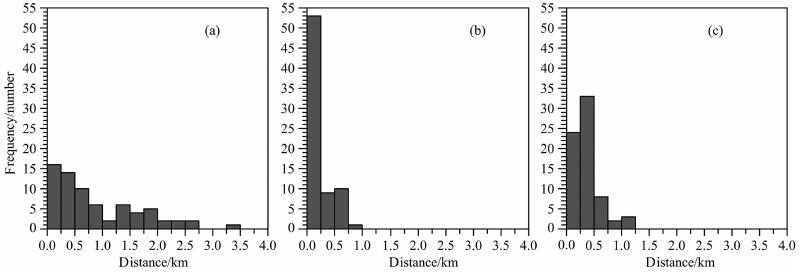 图 11 两种不同反演算法得到的震源位置相对于真实位置的收敛情况 (a)初始扰动的震源位置分布; (b) V+S反演后相对于真实震源位置的收敛情况; (c) V+R+S反演后相对于真实震源位置的收敛情况. Fig. 11 The convergence to the real source locations after inversion by two different algorithms (a) The distance distribution between the real and the initial source locations; (b) The distance convergence to the real source locationsa fter V+S inversion; (c) The distance convergence to the real source locations after V+R+S inversion. |
