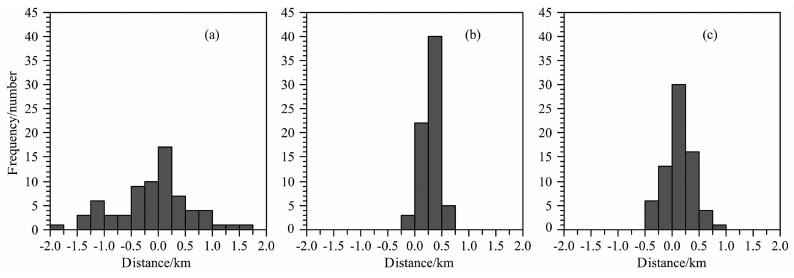 图 12 两种不同反演算法得到的震源深度相对于真实震源深度的收敛情况 (a)初始扰动的震源深度分布; (b) V+S反演后相对于真实震源深度的收敛情况; (c) V+R+S反演后相对于真实震源深度的收敛情况. Fig. 12 The convergence to the real focus depths after inversion by two differental gorithms. (a) The distance distribution between the real and the initial focus depths; (b) The distance convergences to the real focus depths after V+S inversion; (c) The distance convergences to the real focus depths after V+R+S inversion. |