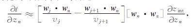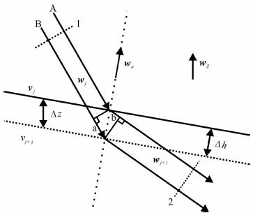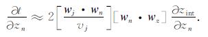 其中zn和zint分别是界面反射点和初始反射点的深度(有关wj, wj+1, wn和wz, 见图 2所示), vj和vj+1则分别是界面两侧的速度值.当仅考虑反射时, wj+1· wj=-wj·wn和vj=vj+1, 则(16)式简化为下式: