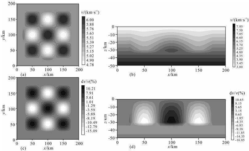 图 4 三维速度模型 (a)Z=25km水平速度场分布; (b)Y=104km垂直剖面速度场分布; (c)相同水平速度场和一维层状背景速度场的百分比差值, 或称之为速度异常场; (d)相同垂直剖面速度场和一维层状背景速度场的百分比差值, 或称之为速度异常场. Fig. 4 3D velocity model (a) Horizontal slice at depth of 25km; (b) Cross section view at Y=104km; (c) Percentage perturbation between the real and 1-D layered velocity field at the depth of 25km; (d) Percentage perturbation between the real and 1-D layered velocity field at one cross section view of Y=104km. |
