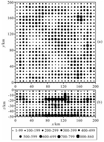 图 6 水平面(a)(Z=25.0km)和垂直剖面(b)(Y=104.0km)切片上各单元内穿过地震射线条数的统计分布 Fig. 6 The numbers of account rays through each cell crossing horizontal slice (a)(Z=25.0km) and vertical slice (b)(Y=104.0km) |