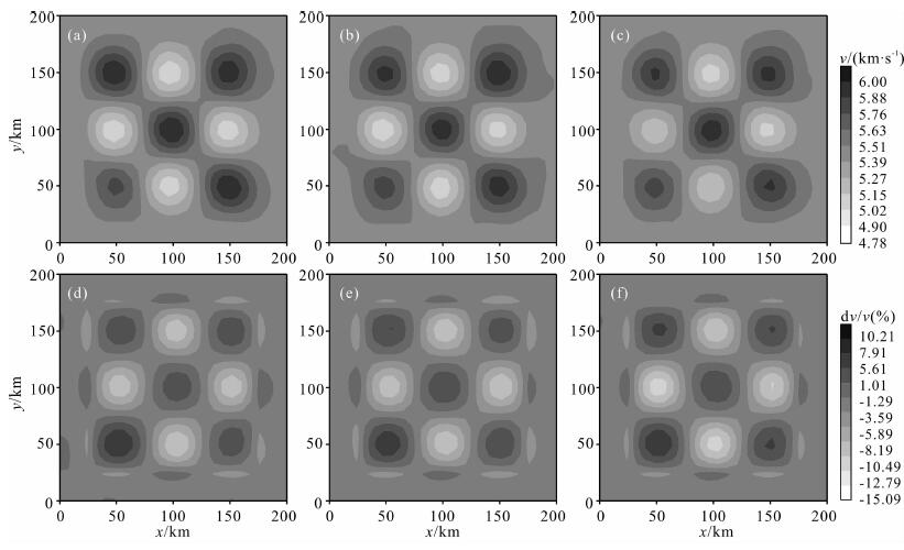 图 7 三种不同反演算法在Z=25km深度的成像结果(a, b, c)和相同深度三种反演解与真实速度的百分比误差(d, e, f)(a, d) V+R反演; (b, e) V+S反演; (c, f) V+R+S反演. Fig. 7 The recovered velocity fields at the depth of 25km for three different inversion methods (a, b, c) and the percentage differences between the real and the inverted velocity fields at the same depth (d, e, f) (a, d) V+R result; (b, e) V+S result; (c, f) V+R+S result.` |