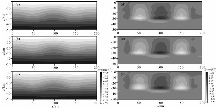 然而, 上述走时三参数同时反演算法, 要么是正演采用传统的射线追踪算法[21], 要么是反演中采用受人为因素影响的加权处理[22], 都有可能影响最终的成像结果.另外, 地震资料主要是利用初至波和反射波走时数据, 并没有考虑多震相走时资料.我们知道, 走时成像的分辨率除了受高频假设制约外, 主要受制于射线覆盖率, 确切地说, 受制于不同震相射线的交错概率.因此, 走时三参数同时反演的成败与否, 其一是尽可能采用多震相走时资料; 其二是采用合适的反演算法.鉴于此, 本文将目前流行的基于网格/单元波前扩展的多震相射线追踪算法之一(分区多步不规则最短路径算法)和地震多参数反演算法(子空间反演法)相结合, 提出了一种可利用地震多震相走时资料进行三参数同时反演的方法技术.与走时双参数同时反演成像结果对比分析, 所提出的三参数同时反演算法是一种行之有效的地震走时三参数同时反演成像方法技术, 同时该算法对走时数据中的随机噪声并不敏感, 说明具有较好的实用价值.