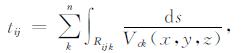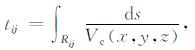 三维情形下根据射线理论, 由第i个震源经反射点到达第j个检波器的走时可表述为下列积分: