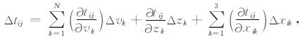 其中vk和zk分别是第k个单元内的速度分布和第k个反射点的深度, Δvk和Δzk则分别是相应速度和反射点深度的扰动量.Δxk(k=1, 2, 3)是第k个震源分别在X, Y和Z方向的扰动量.