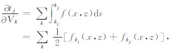 (14)式中第一项, 即有关走时关于速度的一阶偏导数计算如下:为简便起见, 这里略去震源编号i, 则tj是第j条射线Rj的走时; vk是长度为N的模型空间中的第k个单元的速度分布; zk是离散界面点中第k个点的深度值.