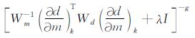 Wd和Wm分别为数据加权矩阵和模型加权矩阵, d0和d(m)分别是观测数据和理论计算数据, λ为阻尼因子.由(1)和(4)式, 可得子空间反演算法的迭代形式解为