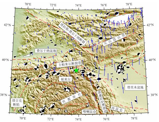 图 1 天山-帕米尔-兴都库什地区附近地质构造简图(改编自文献[1])及1976-2008年间历史地震震源机制解(哈佛大学全球CMT地震目录)和GPS位移量(改编自文献[2]).红色虚线表示震中区域附近地区主要断层,绿色五角星表示震中位置,蓝色箭头表示GPS运动速率(相对于欧亚大陆) Fig. 1 Simplified regional tectonic map of Tianshan-Pamir-Hindukush area (adopted from Ref.[1]) over layered with historical earthquakes happened between 1976-2008(Harvard global CMT catalog) and GPS velocity (adopted from Ref.[2]).Bold red lines indicate major fault in study region, green pentagram marks the epicenter, blue arrow indicates GPS velocity (relative to Eurasia) |