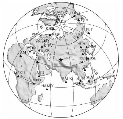 图 2 地震台站位置分布图, 图中黑色三角形标示了地震台站位置, 黑色字母表示台站名称, 黑色五角星表示了震中位置 Fig. 2 Distribution map of broad-band seismic stations used in this study, station name marked up of triangle, black triangles denote seismic station and black pentagram denotes epicente |
