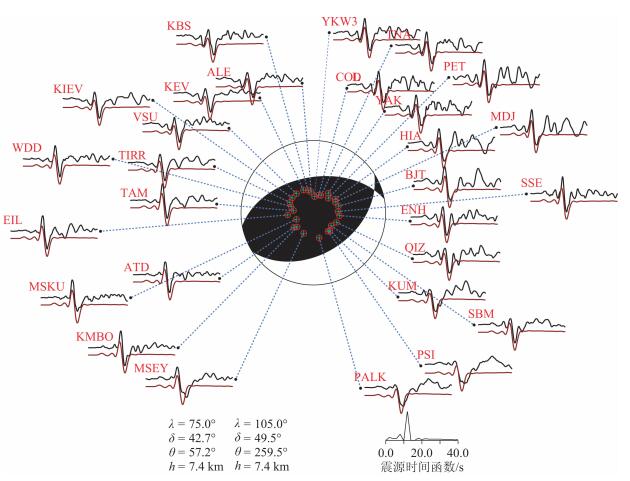 图 3 点源模型震源机制解(采用下半球投影方式).黑线、红线分别表示点源模型P波垂向位移的理论图和实际观测资料.“+”(绿)和“-”(兰)的圆圈表示P波初动极性及投影位置, 红色圆圈表示用于波形反演的台站的投影位置.图下方给出了两组节面解(走向、倾角、滑动角)和点源模型的震源时间函数(右下) Fig. 3 Focal mechanism obtained from inversion of signal point-source mode (flower hemisphere projection).The black and red lines represent observed and synthetic ground motion waveforms, respectively.The green and blue circles with "+" and "-" indicates the polarity of the direct P wave, and the red circles are the projection of the stations.The source time functions and parameters of two possible fault planes (focal depth, strike, dip and rake) |