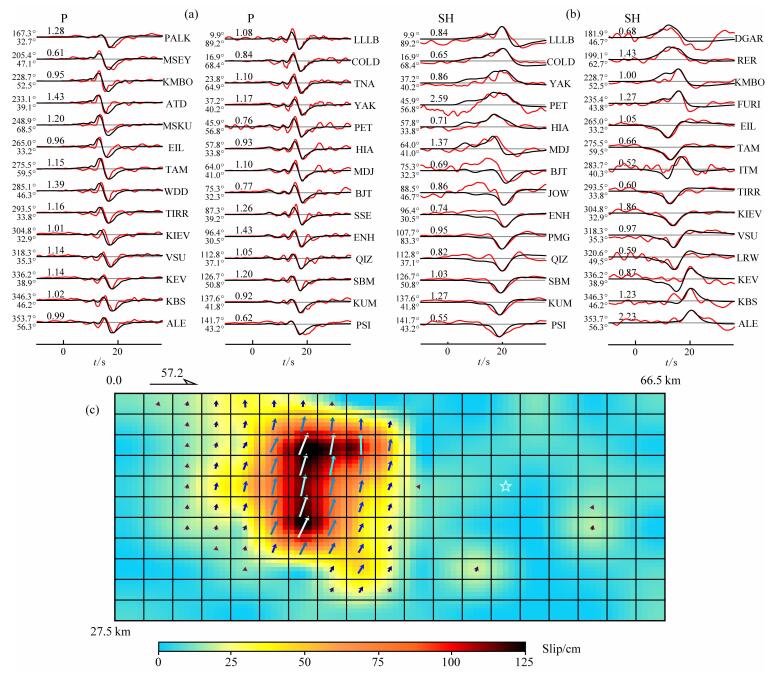 图 4 (a)和(b)分布显示有限断层模型拟合的P波和SH波.图中红线、黑线分别表示实际波形和理论波形, 波形左侧数字给出了台站方位角和震中距, 左上方数字给出了振幅比, 右方字母表示地震台站名字; (c)断层面上的最终滑动破裂分布图, 图中白色五角星表示初始破裂点, 箭头表示子断层面元的滑动矢量, 图中冷色表示滑动量较小区域, 暖色表示滑动量较大区域, 图片左上角半箭头表示有限断层面走向 Fig. 4 (a) and (c) show comparison of the observed and synthetic P and SH waveforms for finite fault model, respectively; black lines indicate observed, red lines indicate synthetic. The station name, azimuth, epicenter and station names are marked up for each waveform.(c) Final slips distribution at the fault plane, white pentagram indicates initial rupture position, arrows indicate slip vector, cold colors indicate lower slip area and warm colors indicate high slip area, half arrow in the left upper corner indicate strike of the finite fault |
