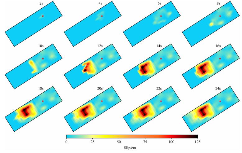 图 5 地震发生时断层面上破裂在2, 4, 6, 8, 10, 12, 14, 16, 18, 20, 22s和24s时快照.图中红色五角星表示初始破裂点, 冷色表示低滑动区, 暖色表示高滑动区 Fig. 5 Snapshots of rupture process at the fault plane at 2, 4, 6, 8, 10, 12, 14, 16, 18, 20, 22s and 24s.The red pentagram indicate initial rupture position, cold colors indicate lower slip area and warm colors indicate high slip are |