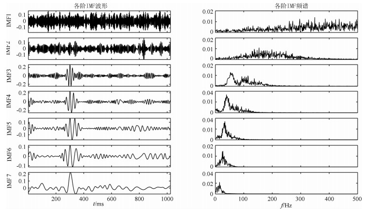图 2 第一次EMD得到的IMF及其频谱 Fig. 2 IMF of first EMD and its spectra |