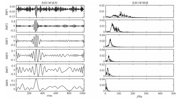 对含噪信号进行EMD,得到各个IMF,并计算各IMF的频谱,结果如图 2所示.EMD的结束条件为残差信号rn(t)是单调的或其能量小于原信号的10%.