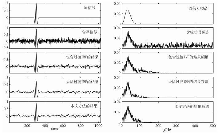 从图中可以看出,包含过渡IMF的去噪结果可以有效的保留有效信号,但去噪效果不理想;去除过渡IMF的去噪结果虽然能够有效去除噪声,但是信号出现较大衰减;而本文方法在保留有效信号的同时,有更好的去噪效果.原含噪信号的信噪比为0 db,包含过渡IMF的去噪结果信噪比为5.42 db,通过本文方法得到的去噪结果的信噪比为7.36 db,而且本文方法对有效信号具有较好的保持,可见该方法是可行且有效的.