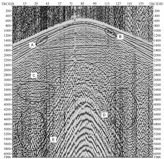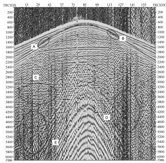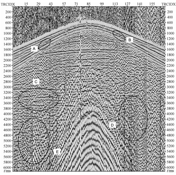 在图 6中,对于A、B两部分,已有方法处理的结果与原信号相比,由于噪声去除的不彻底,几乎没有改善,但是通过本文方法处理后,更好的去除噪声,轴变得更加清晰了,如图 7中A、B所示.从图 6和图 7中的C、D两部分也可以看出本文方法处理后的结果相比于已有方法的结果,由于去除了过渡IMF中的混叠噪声,同相轴变得更加清晰连续.从两幅图中E部分的处理结果的对比明显可以看出本文方法对于随机噪声的压制更彻底,处理效果更好.从图 6和图 7的对比,总体上来说本文的方法和已有方法相比,能够在保留有效信号的同时,有效去除过渡IMF中混叠的噪声,实现地震信号的进一步去噪,提高信噪比,具有更优的去噪效果.