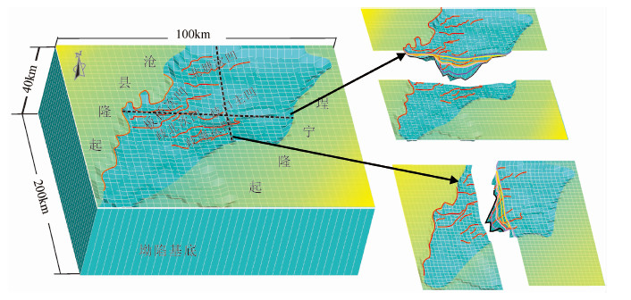 图 2 黄骅坳陷的三维结构模型 (为了便于观看,模型纵向上拉伸了3倍(以下同),但在模拟过程中完全按歧口凹陷的真实空间结构进行计算) Fig. 2 3D model of the Huanghua Depression (For easy observation, the 3D model has been extended three times in vertical, but the structures of the model is completely based on the structure of the Huanghua Depression in the process of calculation) |