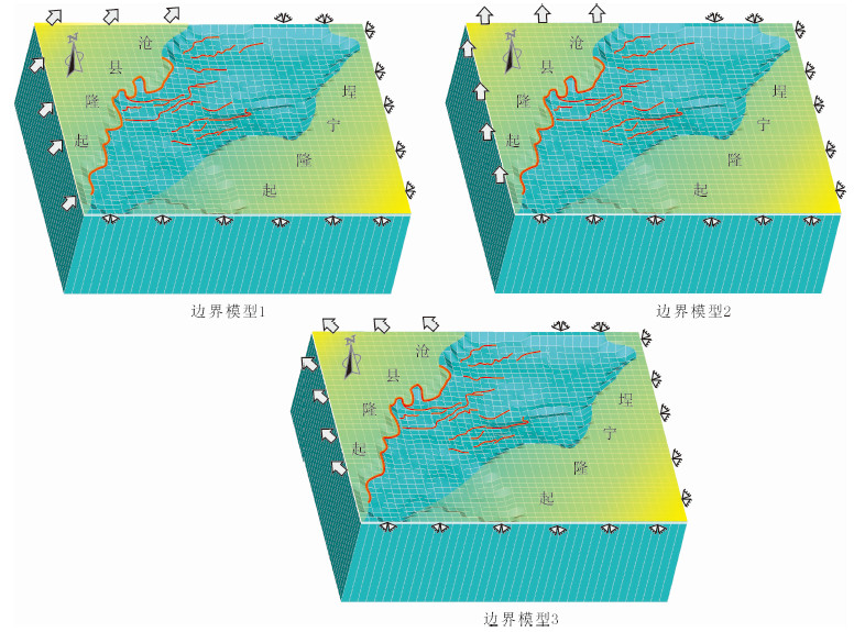 对于模型边界条件的选择,主要考虑盆地形成现今空间结构的三种观点(图 4).第一种观点强调黄骅坳陷构造应力场的分布特征明显受北东向边界断层走滑作用的影响[5].因此,在模型中的西边界设置为具有北东向的位移,模型的南北边界和东边界设置为固定边界,模型底边界设置为垂向固定,水平方向为自由边界(图 4a).第二种观点认为黄骅坳陷是一个张扭性质的盆地,既强调了走滑作用对坳陷的影响,也强调了拉张作用对坳陷的影响[1].基于该种观点,模型中的西边界设置为具有正北方向的拉伸位移,模型南北边界和东边界设置为固定边界,模型底边界设置为垂向固定,水平方向为自由边界(图 4b).第三种观点强调黄骅坳陷的构造应力场主要受沧东坡坪式拆离断层拉张作用的影响,走滑作用只起到调节性作用[8].基于该种观点,模型中的西边界设置为具有北西向的拉伸位移,而模型的东边界和南北两边界设置为固定边界,模型底边界设置为垂向固定,水平方向为自由边界(图 4c).