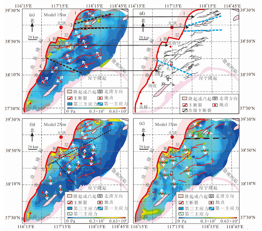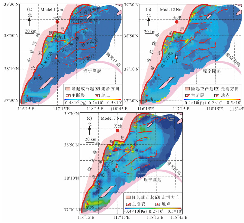 4.1 黄骅坳陷第一主应力的分布特征图 5为在三种边界条件作用下Nm构造界面上第一主应力的分布特征.从图中可以看到,在Nm界面上三种模型的第一主应力的分布特征明显不同.在第一种边界条件下(图 5a),黄骅坳陷张性应力高值区主要介于沧东断层中段和滨海断层之间,这说明在右行走滑作用下沧东断层空间形态的改变能够导致其上盘地层产生较强的张性应力,而张性应力的分布范围受到滨海断层的限定.与这两条断层相比,张应力高值区内的大张陀断层对区域应力场分布起到了调解性作用,使得局部区域产生异常应力.与此同时,在该种边界条件下坳陷内其它区域张应力值变化则不明显.