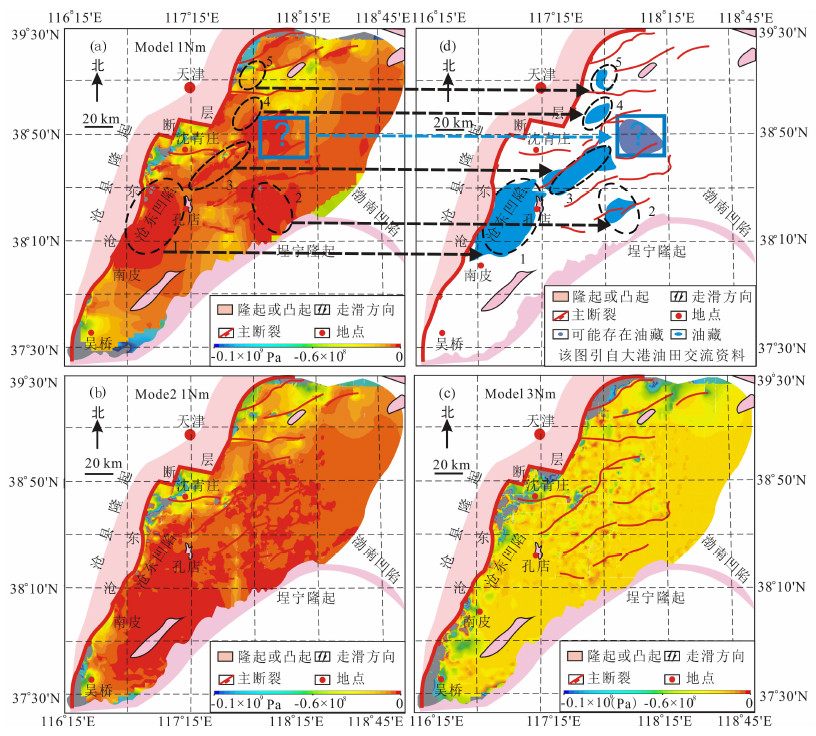 图 6 第三主应力分布特征与已知油藏的对比 Fig. 6 The third principal stress distribution of three models compared with the distribution of oil reservoirs in the Huanghua Depression In the model1, ecllipse regions(1, 2, 3, 4, 5)with black dash lines show certain correlation with the position of five oil reservoirs in the Huanghua Depression, respectly.Blue rectangle district(?)corresponds to the major QiKou Sag which may be a potential oil reservoir |