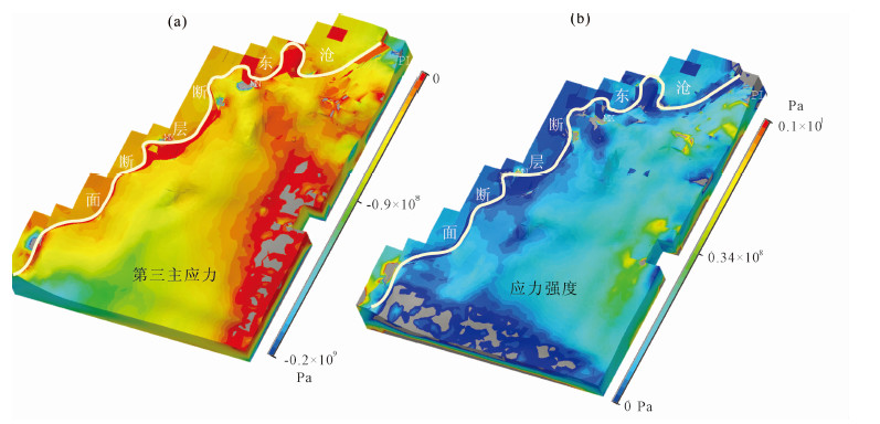 最后,沧东断层向下延伸的滑脱面对坳陷的影响.通过北塘次凹与中、南部凹陷应力强度的对比能够看到,不含滑脱面的北塘次凹的应力强度平均值明显要大于含滑脱面的中、南部凹陷,这说明除断层组合样式外滑脱面存在与否同样影响了区域应力场的分布.而从滑脱面的应力分布特征来看(如图 9所示),第三主应力绝对值的低值区主要位于断面北西向的隆起带上,并将断面分割为南北两部分,其中南部压性应力较强,北部较弱,而北部低值区的上部恰好对应于黄骅坳陷现今的沉积、沉降中心.应力强度在滑脱面上的区分并不明显(图 9b),只是在个别区域出现应力强度值的异常.这种异常可能与滑脱面和上部断层间的相互作用有关,而对于两者间是如何相互影响的,未来还须做进一步的工作.