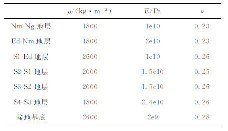 由于图 2的模型只考虑在现今地质条件下盆内应力场的分布特征,模拟时间相对较短(约2万年)模型厚度相对较薄(平均约30km),因此,忽略了盆地长时间构造演化过程中蠕变或松弛以及下地壳和软流圈中粘弹性属性对盆地的影响.同时,认为黄骅坳陷在纵向上已经充分压实,因此只考虑平面构造应力对坳陷的影响,而忽略重力对其造成的影响.基于以上两点,在构建黄骅坳陷力学参数模型的过程中只考虑其线弹性行为.对于各套地层间以及与坳陷基底上的差异,主要通过调节杨氏模量(E)、泊松比(υ)以及地层密度(ρ)来实现(表 1).其中,沉积盖层中模型参数的选择主要基于安欧[29]、胡才志等[27]对地层样品测试分析的结果,具有一定的可信度.而盆地基底的力学参数主要通过渤海湾地区横波速度和纵波速度间的关系式计算得出[42].