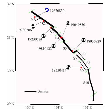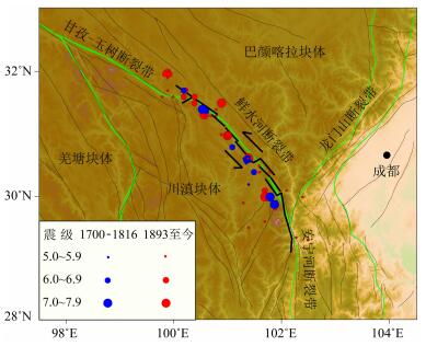 图 1 鲜水河断裂带的构造背景及1700年来5级以上地震分布黑线表示鲜水河断裂带,灰线表示活动断裂[5],绿线表示块体边界[6]. Fig. 1 Sketch map of tectonics background and distribution of earthquakes with M≥5 since 1700 on Xianshuihe fault zone The black line is the Xianshuihe fault zone, the gray lines are the active faults [5], and the green lines are the boundaries of activity block[6]. |