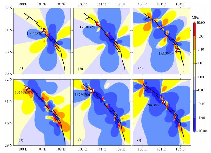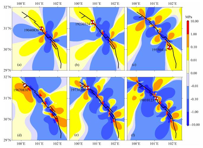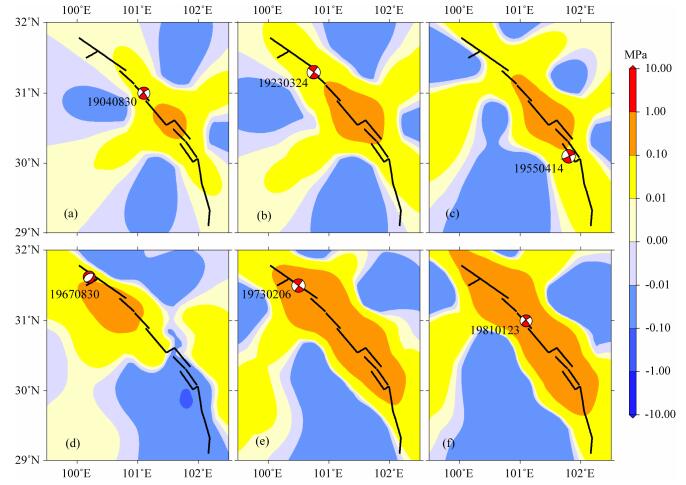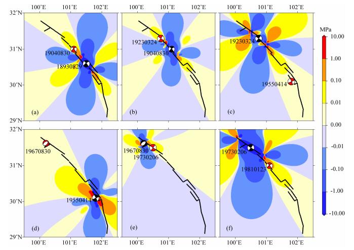 图 4 1893年以来鲜水河断裂带先前所有地震的同震位错引起的累积库仑应力变化 计算深度l0 km,红色震源球表示接收断层震源机制.(a)1893年地震的同震引起的1904年地震断层面上的库仑应力变化;(b) 1893年地震的同震和1904年地震的同震共同引起的1923年地震断层面上的库仑应力变化;(c)1893年以来,1955年地震发生前的所有强震的同震位错共同引起的库仑应力变化;(d)1967年地震的先前所有强震的同震位错共同引起的库仑应力变化;(e)1973年地震的先前所有强震的同震位错共同引起的库仑应力变化;(f)1981年地震的先前所有强震的同震位错共同引起的库仑应力变化. Fig. 4 Cumulative Coulomb failure stress changes caused by the co-seismic dislocations of previous events on the Xianshuihe fault zone since 1893 The calculated depth is 10 km, the red source ball represents focal mechanism of the receive fault. (a)Coulomb stress changes on the 1904 event's fault plane associated with the co-seismic dislocations of the 1893 event. (b)Coulomb stress changes associated with the co-seismic dislocations of the 1893 event and the 1904 event. (c)Cumulative Coulomb stress changes caused by the co-seismic dislocations of previous events just before the 1955 event. (d)Coulomb stress changes caused by the co-seismic dislocations of previous events just before the 1967 event. (e)Coulomb stress changes caused by the co-seismic dislocations of previous events just before the 1973 event. (f)Coulomb stress changes caused by the co-seismic dislocations of previous events just before the 1981 event. |
