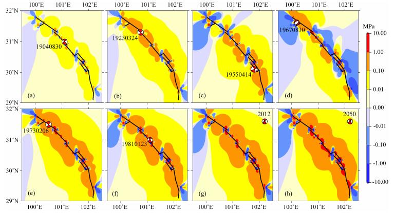 图 7 1893年起鲜水河断裂带构造应力加载引起的库仑应力积累 计算深度l0 km,红色震源球为接收断层震源机制.(a)1893-1904年的长期震间构造应力加载引起的1904年断层面上的库仑应力积累;(b)1893-1923年的震间效应引起的库仑应力积累;(c)1893-1955年的震间效应引起的库仑应力积累;(d)1893-1967年的震间效应引起的库仑应力积累;(e)1893-1973年的震间效应引起的库仑应力积累;(f) 1893-1981年的震间效应引起的库仑应力积累;(g) 1893-2012年的震间效应引起的库仑应力积累;(h)1893-2050年的震间效应引起的库仑应力积累,(g、h)中接收断层的震源机制仍参考1981年地震的震源机制. Fig. 7 Accumulation of Coulomb failure stress caused by tectonic loading on the Xianshuihe fault zone since 1893 The calculated depth is 10 km, the red source ball represents focal mechanism of the receive fault. (a) Inter-seismic Coulomb stress accumulation caused by tectonic stress loading just before the 1904 event, since 1893. (b)Inter-seismic Coulomb stress accumulation just before the 1923 event. (c)Inter-seismic Coulomb stress accumulation before the 1955 event. (d)Inter-seismic Coulomb stress accumulation before the 1967 event. (e)Inter-seismic Coulomb stress accumulation before the 1973 event. (f)Inter-seismic Coulomb stress accumulation before the 1981 event. (g)Inter-seismic Coulomb stress accumulation until just before 2012. (h) Inter-seismic Coulomb stress accumulation till 2050, using the focal mechanism of the 1981 event for the receive fault. |