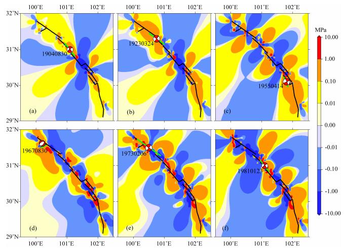 图 8 1893年以来鲜水河断裂带累积库仑应力演化(同震十震后十震间) 计算深度l0 km,红色震源球为接收断层震源机制,绿色线段为发震断层位置.(a)1893年地震(同震十震后)以及1893-1904年震间长期构造应力加载引起的1904年地震断层面上的累积库仑应力变化;(b) 1923年地震发生前的累积库仑应力变化;(c) 1955年地震发生前的累积库仑应力变化;d)1967年地震发生前的累积库仑应力变化;(e)1973年地震发生前的累积库仑应力变化;(f)1981年地震发生前的累积库仑应力变化. Fig. 8 The evolution of cumulative Coulomb failure stress changes on the Xianshuihe fault zone since 1893 The calculated depth is 10 km, the red source ball represents focal mechanism of the receive fault, the green solid line represents the location of seismogenic fault. (a) Coulomb stress evolution until just before the 1904 event, stress changes associated with the 1893 earthquake aswell as tectonic stress changes on the fault segments since 1893 are included. (b)Cumulative Coulomb stress changes until just before the 1923 event. (c)State of Coulomb stress just before the 1955 event. (d)State of Coulomb stress before the occurrence of the 1967 event. (e)Cumulative Coulomb stress changes just before the 1973 event. (f) Cumulative Coulomb stress changes before the 1981 event. |