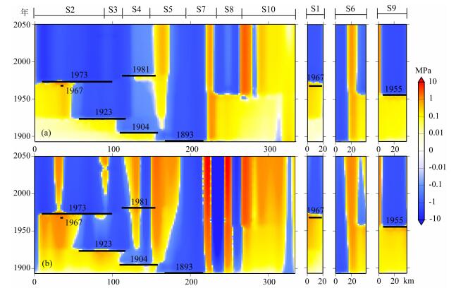 图 9 1893-2050年沿鲜水河断裂带走向的库仑应力演化 (a)强震(同震+震后)引起的库仑应力演化;(b)累积库仑应力演化(同震+震后+震间). Fig. 9 The evolution of cumulative coulomb failure stress along the Xianshuihe fault zone from 1893 to 2050 (a) The evolution of Coulomb stress changes caused by earthquakes (co-seismic + post-seismic), (b) The evolution of cumulative Coulomb failure stress changes (co-seismic+post-seismic+inter-seismic). |