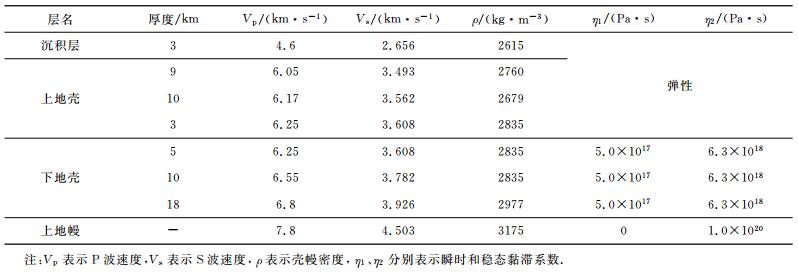 3 模型的建立 3.1 介质模型本文参考川西地区的奔子栏-唐克地震人工测深剖面的结果, 给出地壳与上地幔的速度和密度结构(表 1), 鲜水河断裂带位于剖面中部, 测线在道孚附近穿过断裂带[30].鲜水河断裂带和东昆仑断裂带同属青藏高原中部的“松潘甘孜-羌塘-拉萨”古特提斯复合地体[31], 作为地体边界的东昆仑断裂的南北两侧在物质组成、变形构造体制、演化历史、地球物理异常及现代构造地貌特征上均有明显差异, 印度/亚洲碰撞后, 其由韧性剪切转变为脆性剪切, 南侧为巨厚的三叠系复理石岩系; 而青藏高原东南缘大量物质向南东及南方向逃逸, 鲜水河断裂带形成并切割了三叠系砂板岩地层[31].故本文在建立介质模型时, 更多地参考了与鲜水河断裂带同属巴颜喀拉地块边界、均为青藏高原强烈活动的左旋走滑的东昆仑断裂带的流变性质[10, 30].邵志刚等[32]利用震后短期内观测数据做约束反演给出的东昆仑断裂南侧的最佳黏滞系数为5.0×1017 Pa•s, 沈正康等[12]分析东昆仑断裂地震间的黏弹性触发时所采用的中下地壳的黏滞系数为6.3×1018 Pa•s, 该系数基于通海、炉霍、共和地震的平均震后形变弛豫时间计算得到, 这两个结果分别对应本文震后黏滞松弛的短期和长期效应.我们基于Burgers体模型计算震后库仑应力演化, 下地壳、上地幔黏滞系数取η1=5.0× 1017, η2=6.3×1018(表 1).