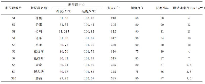 3.2 断层分段及同震位错模型计算断层段的震间构造加载引起的库仑应力变化时, 需确定鲜水河断裂带的主断层段划分, 并给定其长期滑动速率.本文主要参考已有的研究结果[15, 36-37], 将该断裂带划分为10个断层段, 自西向东依次为炉霍、恰叫、道孚、八美、雅拉河、色拉哈、康定、折多塘、磨西, 以及处于甘孜玉树和鲜水河断裂带之间拉分区的侏倭段.滑动速率多为地质上给出的长期平均滑动速率, 西北段相对于东南段较高.断层分段的相关参数见表 2.