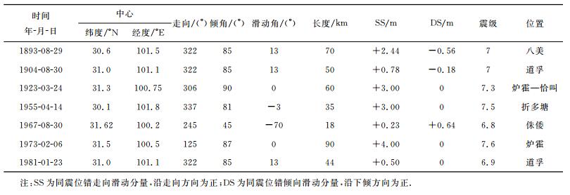 鲜水河断裂带自1893年以来共发生7次M≥6.7强震, 本文主要参考Papadimitriou等[15]和Wen等[4]给出的同震位错及发震断层产状.除1967年侏倭M6.8地震发生在两个大型左旋走滑断裂之间的拉分区, 属正断型地震外, 其余六个地震均以走滑运动为主.各参数见表 3.