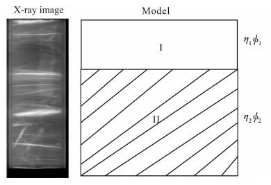 图 1 含天然气水合物层X射线成像和两个端元的层状介质模型[5] Fig. 1 X-ray image of gas hydrate bearing sediments and two-component laminated media model[5] |