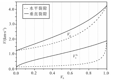 2.2 模型分析在裂隙充填型天然气水合物层,测井测量的速度与裂隙倾角和水合物饱和度有关,在相同水合物含量时,不同的裂隙倾角对应不同的纵横波速度.图 2中给出了当裂隙水平和垂直时,纵波和水平极化横波(Vsh)速度随水合物体积分数的变化.假设端元Ⅱ中孔隙度为φ2=0.6,沉积物矿物组分及百分含量为NGHP01-10D井的岩芯分析结果,见表 1.当水合物体积分数Vh=0时,表明模型中不存在裂隙充填型水合物,计算的速度为饱和水的孔隙介质的速度;当Vh=1时,表明模型中全部为裂隙充填型水合物,计算的速度为纯水合物的速度.图 2表明纵波和水平极化横波(Vsh)速度都随着水合物体积分数增加而增大.在一定的水合物体积分数下,裂隙倾角越大,各向异性介质模型中的纵波横波速度越大.