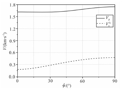 图 3 水合物体积分数为0.1时,纵波和水平极化横波速随入射角变化 Fig. 3 Variation between P-wave and horizontally polarized S-wave velocities versus incidence angle at volume fraction of gas hydrate equals to 0.1 |