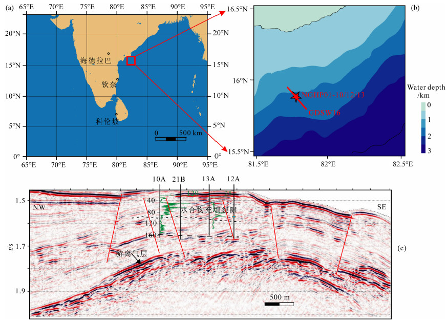 图 4 (a)印度K-G盆地地理位置;(b)K-G盆地水深分布以及站位NGHP01-10,13,12和21位置;(c)三维测线中过NGHP01-10A,13A,12A和21B井的测线及钻井位置,绿线为10A和13A井电阻率测井;裂隙充填型水合物位于不同深度和不同厚度;地震剖面上BSR不明显. Fig. 4 (a)Location of K-G Basin; (b)K-G Basin water depth and Site NGHP01-10, 13, 12, 21 distribution; (c)The seismic profile passed sites NGHP01-10A, 13A, 12A and 21B and resistivity at hole 10A and 13A.Gas hydrate filled in fractures showing different thickness and different depth.BSR was absent. |