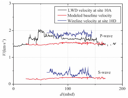 图 5 电缆测井测量的NGHP01-10D井P波和S波(蓝线)速度和随钻测井测量的NGHP01-10A井P波速度(黑线);利用简化的三相介质模型[5]计算的饱和水背景速度(红线). Fig. 5 P and S wave velocities (blue lines)from wireline logging at Hole NGHP-10D and P wave velocity from logging while drilling at Hole NGHP01-10A (black line). The water-saturated baseline velocity calculated using simplified three-phase model[5](red line). |