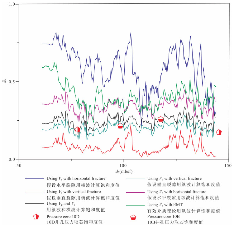基于不同速度,利用层状介质模型计算NGHP01-10D井天然气水合物饱和度不同.利用水合物呈均匀分布的有效介质模型,计算的水合物饱和度远大于压力取芯计算的水合物饱和度.当水合物充填在裂隙中时,假设为水平裂隙时,利用纵波速度估算的水合物饱和度与利用有效介质模型假设水合物充填在孔隙空间估算的饱和度相差不大.假设为垂直裂隙时,利用纵波速度计算的水合物饱和度与压力取芯相接近.横波对裂隙倾角变化非常敏感,所以假设倾角水平或垂直时,利用横波估算得到的水合物饱和度结果偏离压力取芯结果较大.但是利用纵波和横波速度联合计算的水合物饱和度与压力取芯结果吻合相对较好,水合物饱和度为10%~25%,平均为24%,裂隙的倾角在60°~90°,裂隙倾角较陡.裂隙倾角与区域构造环境有关而呈现定向特性,表明裂隙充填型水合物与孔隙充填型水合物不同,含水合物层具有各向异性.