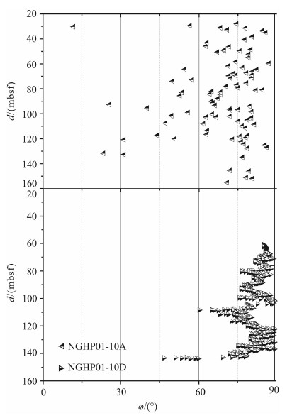 图 8 NGHP01-10A井测井得到的裂隙倾角和利用纵波和横波联合反演得到的NGHP01-10D井裂隙倾角 Fig. 8 Fracture dips at Hole NGHP01-10A from logging and fracture dips calculated from Vp and Vs at Hole NGHP01-10D |