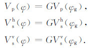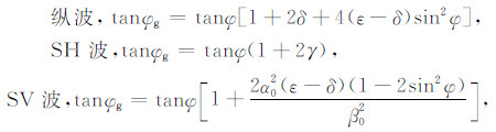 式中φg表示射线方向与层状介质对称轴之间的夹角,GVp、GVsh和GVsv分别是纵波、水平极化横波和垂向极化横波的群速度.公式(5)中群速度与相速度并不相等,在φg对应的波前法线角为φ时,可以利用相速度来计算群速度.对于弱各向异性介质,φg和φ满足以下关系: