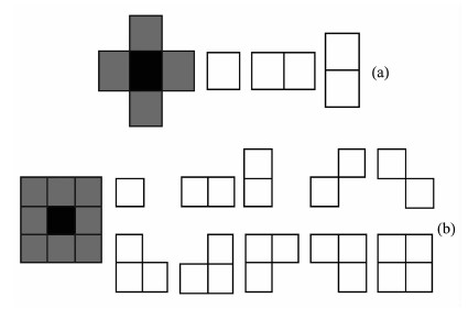 (1)δ(s)⊂S;(2)s∉δ(s);(3)∀s,t∈S,s∈ δ(t)⇔t∈δ(s)、s,t为定义于S上的点,则称δ为定义在S上的邻域系统的集合.此时,s为中心点,δ(s)为邻域点,通过邻域点与中心点的距离定义邻域系统的阶次.这里的距离,通常为欧氏距离.根据不同阶次的邻域系统就可以定义势团,如图 1所示,其中图 1a和图 1b分别为一阶和二阶邻域系统,图中黑色区域为中心点,灰色部分为邻域点.