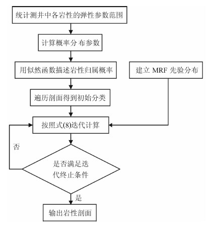 从本文中的例子可以看到,马尔科夫随机场能够很好的描述剖面上弹性参数表示出的轮廓和结构,空间上有一定的连续性,能够细致刻画地下构造空间上的形态,得到合适的分类结果.马尔科夫随机场模型在反映岩性剖面随机性的同时,又能反映剖面的一些潜在固有的空间结构,可以更有效地描述地下构造.本方法采用纵横波速度和密度参数进行岩性识别,事实上,在具体使用中,并不限于这三种弹性参数,采用对岩性更为敏感的参数,能够使本方法的识别结果更精确.此外,该方法也存在一定的局限性,马尔科夫随机场先验模型产生的是一个块的识别结果,如果识别的地层需要强调一种连续的变化,该方法会有一定的局限.