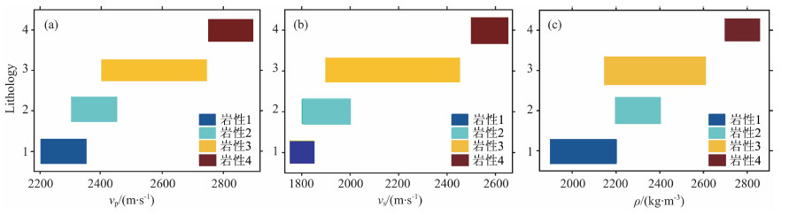 假设在第50道有一口井,并有纵波速度、横波速度和密度曲线.通过自上而下统计各岩性的弹性参数范围,求取高斯分布的均值和标准差.各岩性的弹性参数范围如图 4所示: