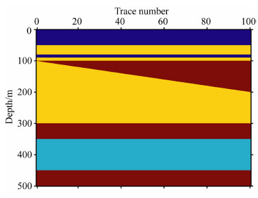 3.1 水平和楔形地层模型图 3为一个垂向上为500个样点,横向上为100道的岩性剖面,整个剖面上一共分为4种岩性.岩性为块状分布,在水平层位置,没有横向上弹性参数的变化.在垂直位置101~200的范围内,有一楔形模型,用来验证对薄层形状的刻画能力.