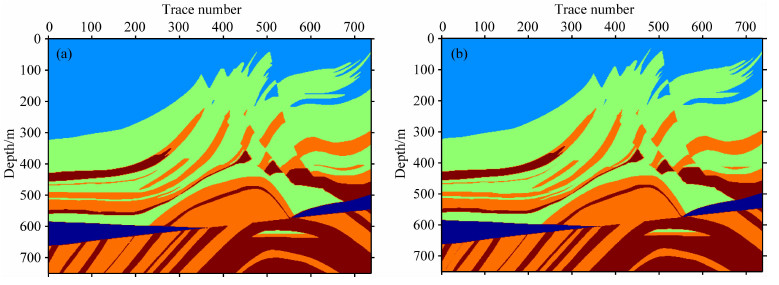 MarmousiⅡ模型是一个垂向、横向上弹性参数变化比较大的模型.在如图 6所示横向上第100道、第700道的位置处,假设有两口井,对100道位置的井根据其弹性参数范围,人为的分为5种岩性,并使用同样的方法流程统计弹性参数范围和计算未知参数.700道位置处的井不参与统计,用于后面同识别结果进行对比.最终得到基于两种不同邻域系统的分类结果(如图 6).图 6a为基于二阶邻域系统的分类结果,图 6b为基于一阶邻域系统的分类结果.